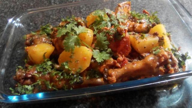Refogue o alho e a cebola no óleo. Acrescente a galinha e deixe refogar um pouco. Adicione um pouco do tempero caseiro, a cebolinha picada e o coentro. Deixe refogar mais um pouco. Coloque o restante dos temperos, a batatinha e a água e tampe. Deixe cozinhar por, em média, 25 minutos ou até a carne estar macia.