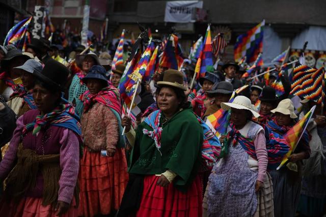 Presión. Mujeres indígenas con la bandera whipala ayer en La Paz. EFE