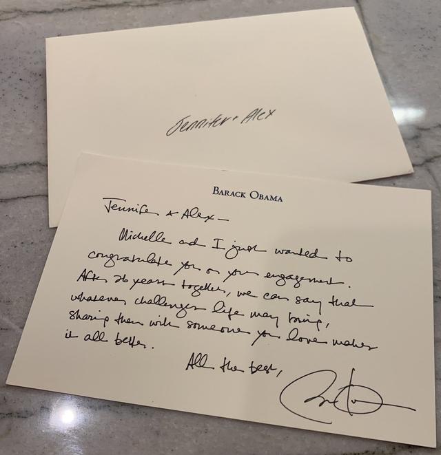 Obama envió una tarjeta escrita a mano a la feliz pareja para felicitarlos por su reciente compromiso.