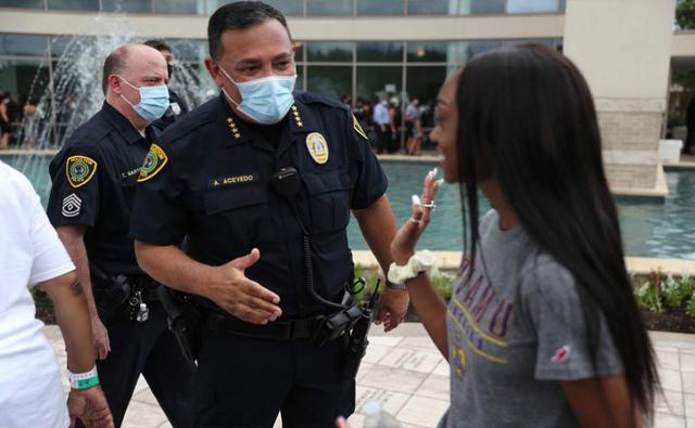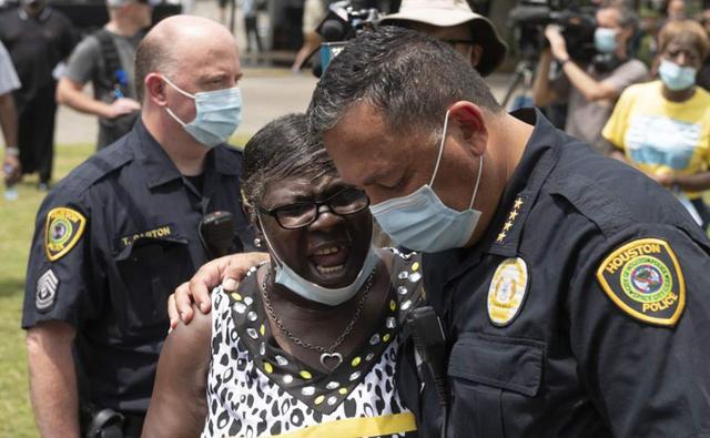 El jefe de la policía de Houston, Art Acevedo, reza con una mujer mientras las personas esperan en la fila para asistir a la presentación pública de George Floyd en la iglesia Fountain of Praise. Foto AFP