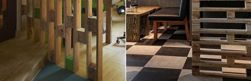 Seguindo a função desses elementos decorativos para uma divisão não estrutural, é possível criar divisórias com desenhos bastante interessantes reutilizando pallets! Essa estrutura ripada de madeira é uma solução econômica e funcional para divisórias de ambientes.