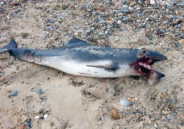 The pair made their gruesome find just days after another walker, Hollie Moran, 24, found another 5ft porpoise with chunks taken out of its head and tail on the beach two miles away at Horsey.