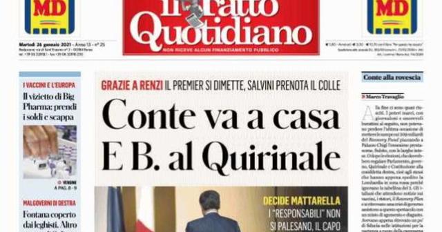 Dopo una settimana di ridicole e spudorate trattative, letteralmente con tutti, Conte è stato convinto dai suoi alleati (non da Matteo né dal Cav) a mollare la presa e tentare di salvare il salvabile. Una scelta di buonsenso e di buongusto, seppur tardiva. Ma Travaglio singhiozza: "Grazie a Renzi il premier si dimette". E poi il diluvio, perché non si fa menzione di un possibile Conte Ter e si prospetta lo scenario catastrofico "Salvini prenota il Colle", "Conte va a casa" "e B. al Quirinale". Insomma, si preannunciano giorni da incubo. Tanto più che il Colle, si sottolinea, avrebbe già minacciato Conte: "Reincarico solo con i numeri". Che cattivone, Mattarella.