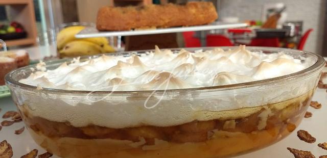 Montagem: coloque as bananas carameladas por cima do creme. Bata as claras em neve e cubra a torta. Leve ao forno preaquecido a 180ºC por 10 minutos.