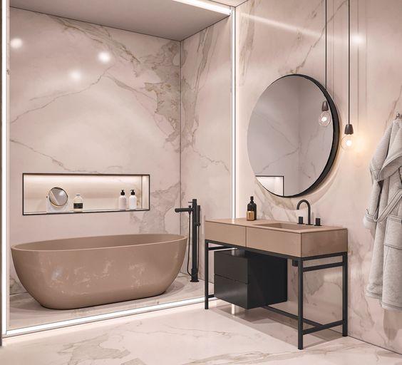 As banheiras de alvenaria podem ser encontradas com uma grande variedade de cores e acabamentos o que permite escolher um modelo que combine com cada estilo de decoração.