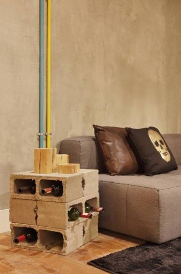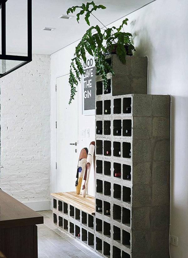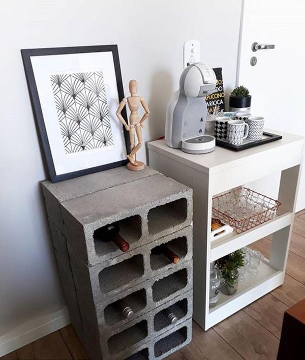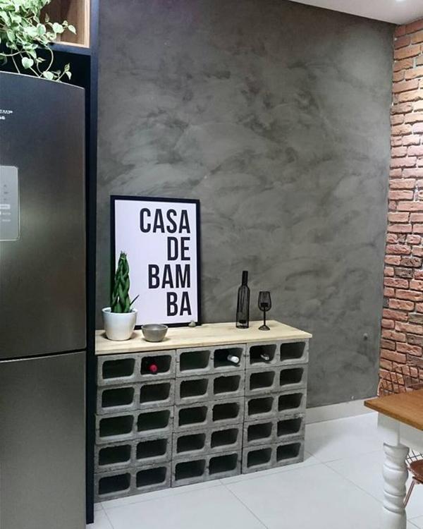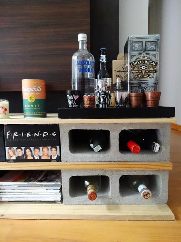 Já falamos por aqui que o uso de blocos de concreto trazem para decor uma pegada jovem e industrial, e que muitas vezes é uma forma barata e fácil de ambientar um espaço ou até construir um móvel. Vou mostrar para vocês adegas feitas com blocos de concreto, grandes e pequenas. Ou seja, dá para fazer no tamanho que seu espaço permite e muitas vezes apenas empilhando blocos ou os dispondo lado a lado, sem a necessidade de fixa-los através de pregos e parafusos, já que o peso dos blocos são suficientes para mantê-los firmes no chão.