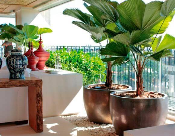 A palmeira-leque destaca-se por suas folhas grandes e plissadasem um tom de verde brilhante. Seu ritmo de crescimento é lento, tornando-a ótima para ser cultivada em vasos grandes, contanto que esteja em um ambiente amplo e bem iluminado, longe da saída de ar dos ar-condicionados. É importante mantê-la afastada do frio, assim como remover suas folhas velhas e secas durante o verão.