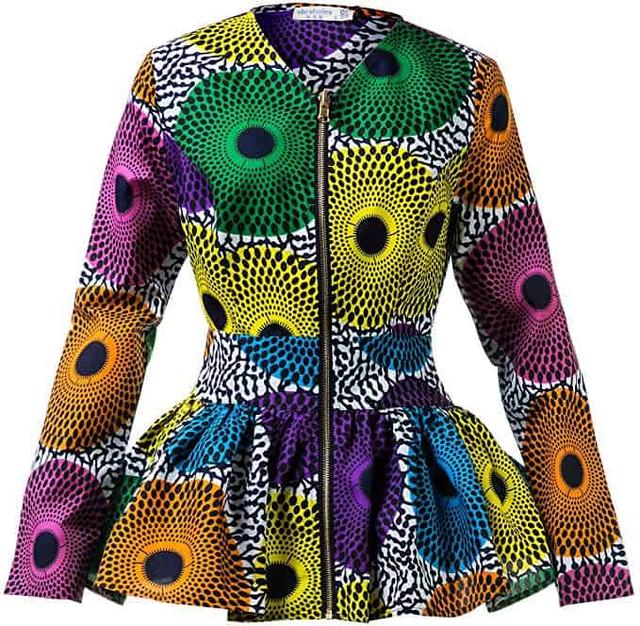 If you’re still craving more African print jackets, this affordable ankara top will surely satisfy your desire. The bright colors contrast beautifully against the bold circles to make this jacket stand out. It features unhidden front zippers and a simple round neckline.