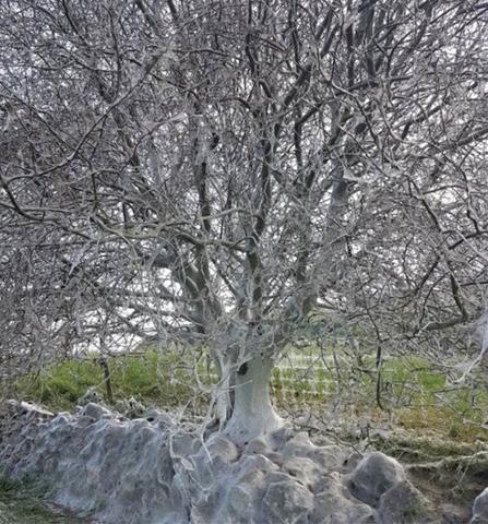 Um árvore, toda coberta por teias brancas, estava tão infestada por lagartas que, para Sutcliffe, "parecia estar se mexendo".