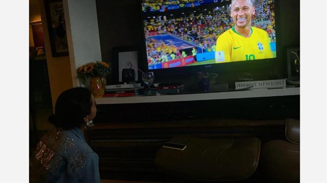 Bruna Marquezine não conseguiu ir para a Rússia dessa vez assistir ao jogo do Brasil contra a Sérvia pela Copa do Mundo nesta quarta-feira (27). Mas a atriz fez questão de ver o namorado, Neymar, bem pertinho da televisão.