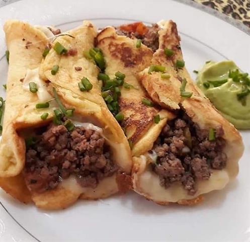 Depois monte as panquecas na frigideira com o recheio que quiser ( eu fiz com carne moída bem temperada, tomate e azeitona). Rend: 4 und