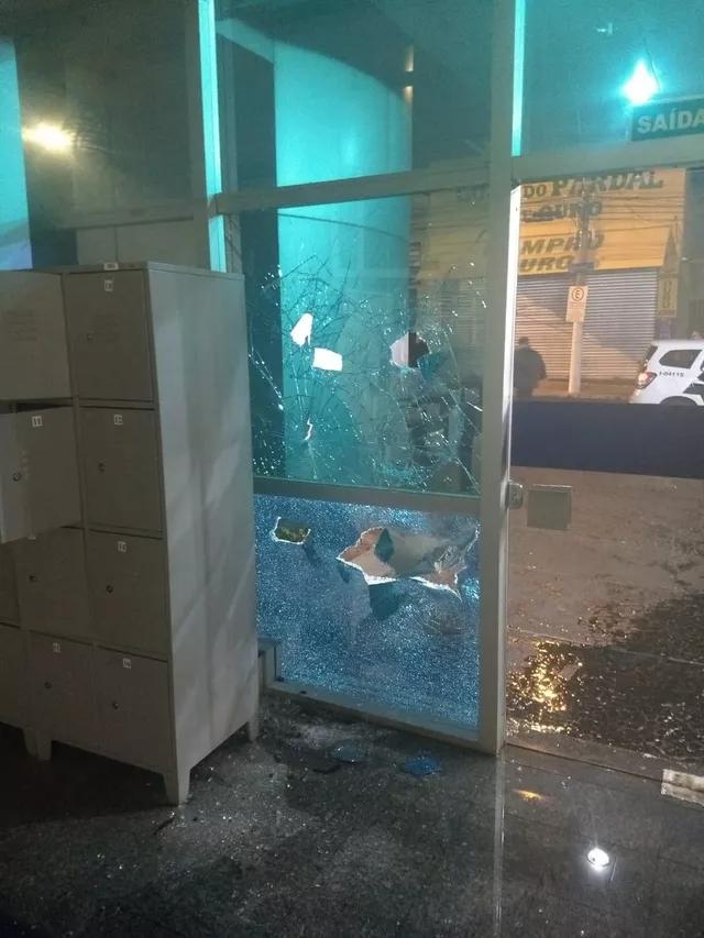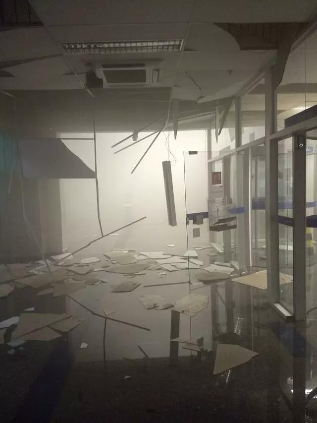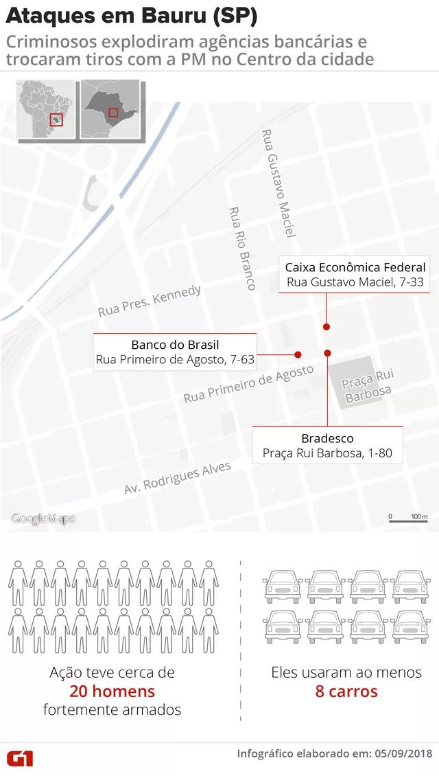 Pelo menos 20 homens participaram da ação criminosa no centro. Eles explodiram uma das agências e atingiram outra. Uma terceira foi alvejada com tiros.