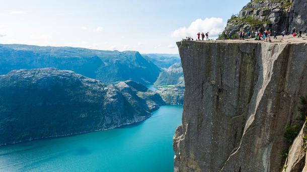 Der Preikestolen ist eine natürliche Felsplattform, die in Ryfylke in der norwegischen Provinz Rogaland liegt. Besucher können sich direkt bis an die Kante begeben, von wo aus es gute 600 Meter in die Tiefe geht. Unten wartet entweder die freiliegende Klippe oder der Fjord.