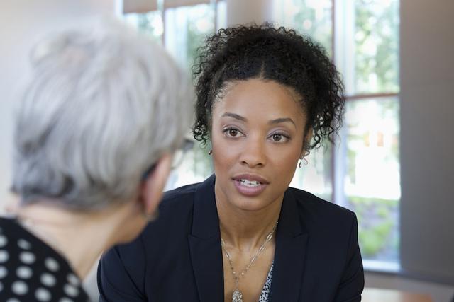 Gettyimages.com/Businesswomen talking in office
