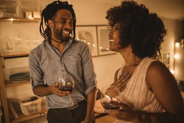 Gettyimages.com/Young couple decorating home for dinner party. They are drinking wine and waiting for guests to arrive. Well dressed.