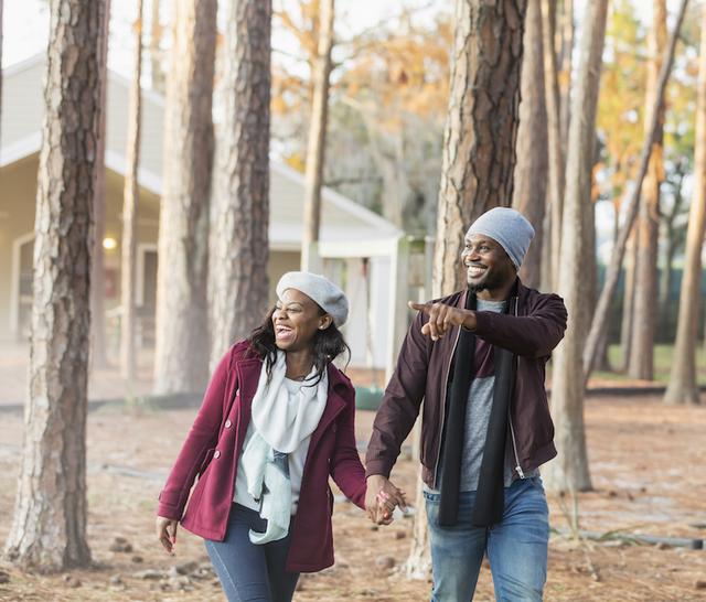 Gettyimages.com/A young African-American couple in front of a cabin in the woods smiling as they walk, holding hands. It is a cold autumn day, so they have dressed warmly in jackets and hats.