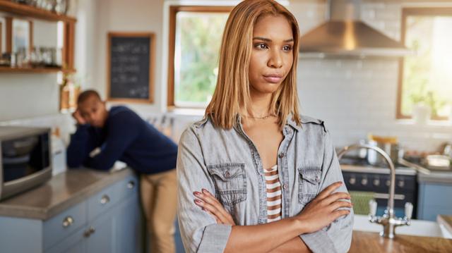 Gettyimages.com/Shot of a young woman looking upset after a fight with her boyfriend who is standing in the background