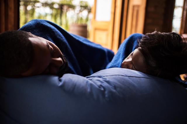 Gettyimages.com/African American couple taking a nap on a bean bag while being covered with blanket. Focus is on woman.