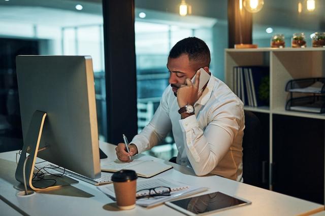 Gettyimages.com/Shot of a young businessman using a mobile phone and writing notes during a late night in a modern office