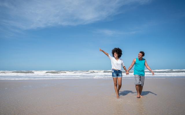 Gettyimages.com/Young couple walking at the beach holding hands and pointing away â?? relationship concepts