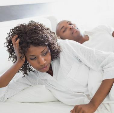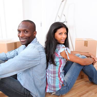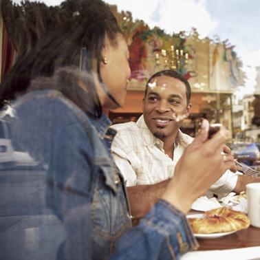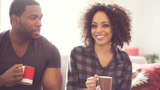 Gettyimages.com/Afro american friendly couple sitting on sofa at home, drinking coffee, talking together. Beautiful woman smiling at camera.