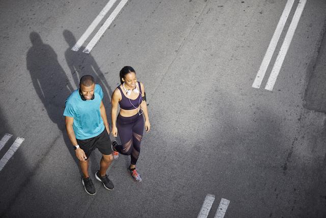 Gettyimages.com/High angle view of couple walking on street. Man and woman are in sports clothing. They are at city during sunny day.