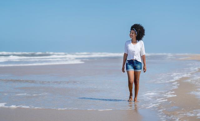 Gettyimages.com/Beautiful African American young woman walking at the beach and looking very happy – lifestyle concepts