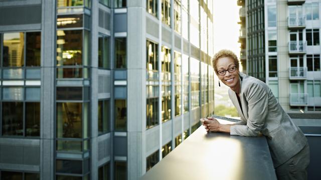 Gettyimages.com/Businesswoman leaning on edge of deck smiling buildings in background
