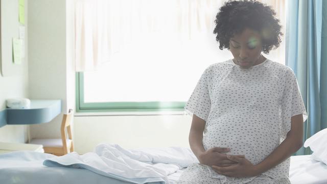 Gettyimages.com/Pregnant African American woman holding her stomach in hospital
