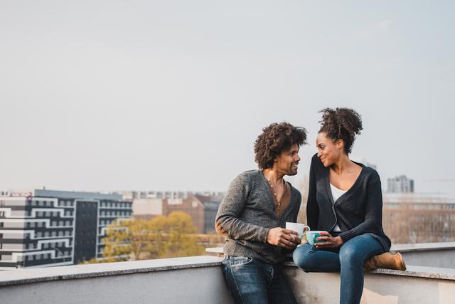 Gettyimages.com/African American couple talking on the rooftop and drinking coffee