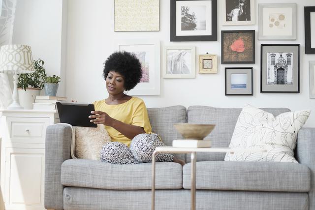 Gettyimages.com/African American woman using digital tablet on sofa