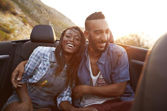 Gettyimages.com/Couple laughing in the backseat of convertible car at sunset