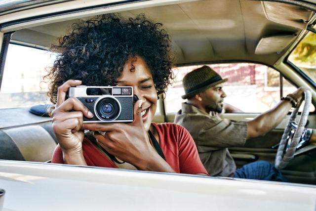 Gettyimages.com/Woman using vintage camera in car