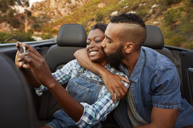 Gettyimages.com/Couple kissing while making selfie in the backseat of convertible car at sunset