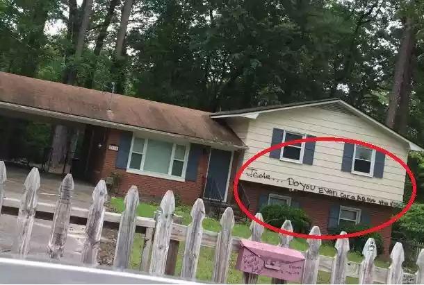 "J. Cole ... Do you even care about the Ville?" the black spray paint across the front of the house read.