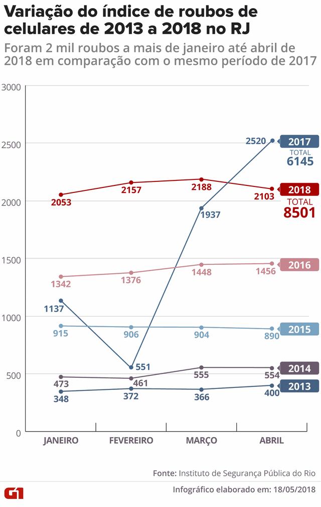 O índice é o maior desde 2013, ano em que o Instituto de Segurança Pública do Rio começou a registrar o delito. Se comparado com o mesmo período de 2013, foram 2,3 mil roubos de celulares a mais registrados no estado: aumento de 38%.