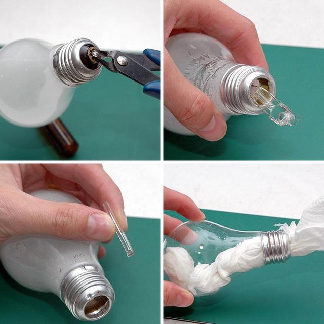 O processo de como fazer artesanato com lâmpadas queimadas pode ser bem diversificado, porém a maneira como você vai abrir a lâmpada, para usá-la posteriormente, é a mesma para qualquer método artesanal que você vá empregar em sua lâmpada. Comece separando todos os materiais que você vai utilizar em seu artesanato. Retire o pino central. Vá tirando as partes da lâmpada com muito cuidado, com o auxílio dos alicates. Quando abrir a lâmpada, limpe-a primeiramente com um papel-toalha e depois com um pano de limpeza. Agora a sua lâmpada está pronta para os usos mais diversos.