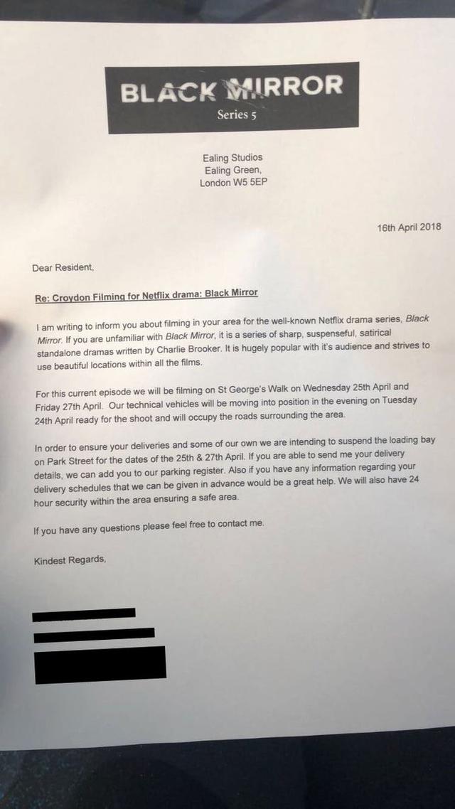 People living in Croyden, a suburb of London, received letters informing them that Black Mirror was going to be filming in their area.