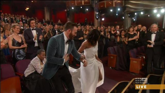 Evans' fortuitous seat in the front row of the show and directly next to Best Supporting Actress winner Regina King made it easy for him to physically support her as she ascended the stairs to accept her award.
