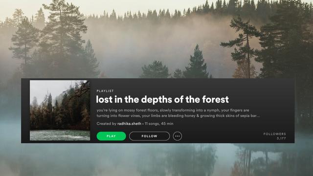 But if you want to be whisked away to another world, another time, a different realm, nowadays Spotify is your host. The playlists themselves might not even be that unique or fantastical, as some have joked (Hozier on a playlist about running wild in the forest? How groundbreaking!). Their success depends upon the tale that users weave in under 150 words to hook the listener.