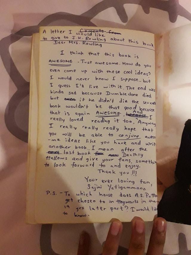 On Sunday, a Harry Potter fan from Sri Lanka tweeted a photo to Rowling. It showed a letter they said they'd written when they were 11 years old, after finishing Harry Potter and the Half-Blood Prince for the first time.