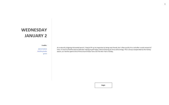 Consider the Jan. 2 Meditation, from Adriel Wallick. (Every day brings a different creator.) Before you even begin the game, you're greeted by a bit of text that sets the scene. The words read more like a daily affirmation than an instruction manual.
