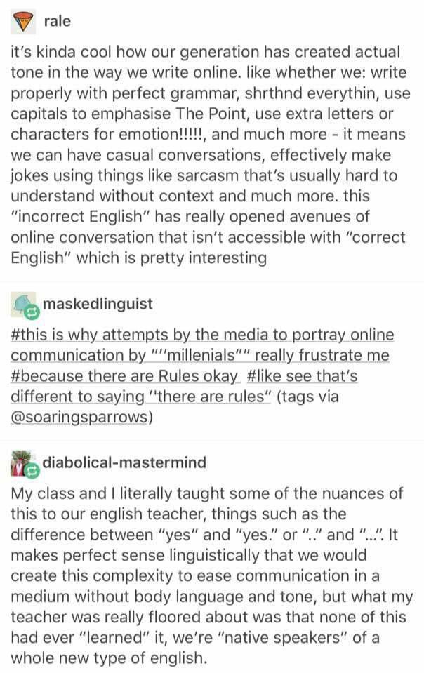 That's because millennials have created a new rulebook for a variant of written English unique to social media. A rulebook which states that deliberately misspelled words and misused grammar can convey tone, nuance, humour, and even annoyance.