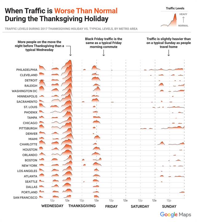 Google has released the worst and best times to drive in 25 U.S. metropolitan areas during Thanksgiving week, based on data which was compiled in 2017.