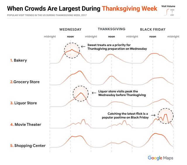 Bakeries are particularly busy on Wednesday afternoon, and liquor stores reach a peak the night before Thanksgiving. After Thanksgiving, hitting the cinema is predictably a busy affair.