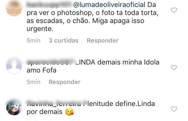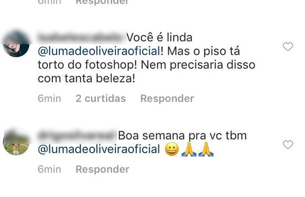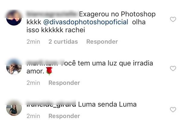 Seguidores mais atentos, no entanto, repararam em um detalhe: ao fundo da imagem, o chão deformado indicava o uso de ferramentas de edição de imagens. "Dá pra ver o photoshop, a foto tá toda torta, as escadas, o chão. Miga, apaga isso urgente", sugeriu um seguidor. "Você é linda, Luma. Mas o piso tá todo torto de photoshop. Nem precisaria disso com tanta beleza", opinou outro.