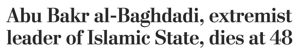The Post has since changed the headline to “Abu Bakr al-Baghdadi, extremist leader of Islamic State, dies at 48.”