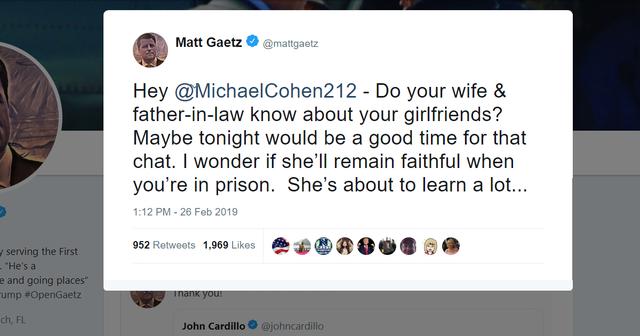 On Tuesday afternoon, Gaetz threatened Cohen with unsubstantiated allegations, tweeting “Hey @MichaelCohen212 – Do your wife & father-in-law know about your girlfriends? Maybe tonight would be a good time for that chat. I wonder if she’ll remain faithful when you’re in prison. She’s about to learn a lot…”