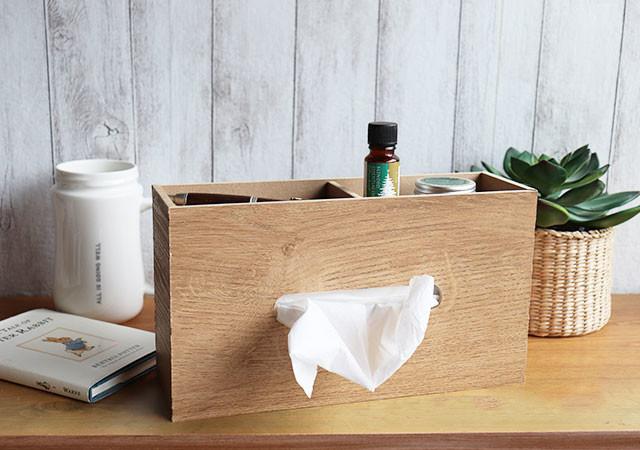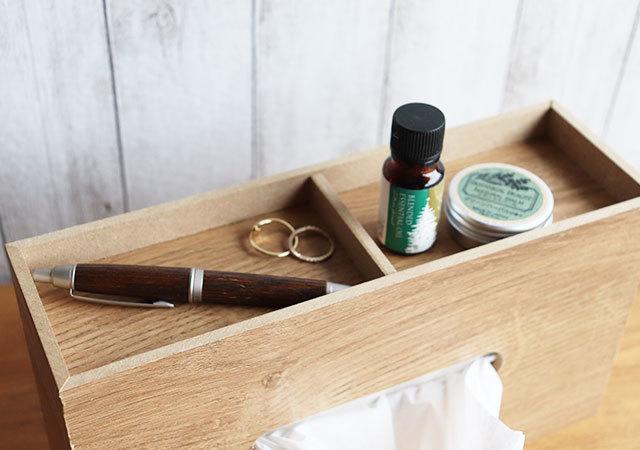 横置きタイプのボックスティッシュカバーは、ウッド調の優し気な風合いと、天面についた小物置きスペースで、デザイン性がかなり高め。