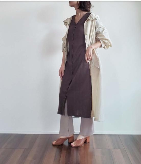 中にロング丈のワンピースを仕込んで、縦長Iラインコーデを作りました。ブラウン系の同系色を合わせてまろやかなコーデに。